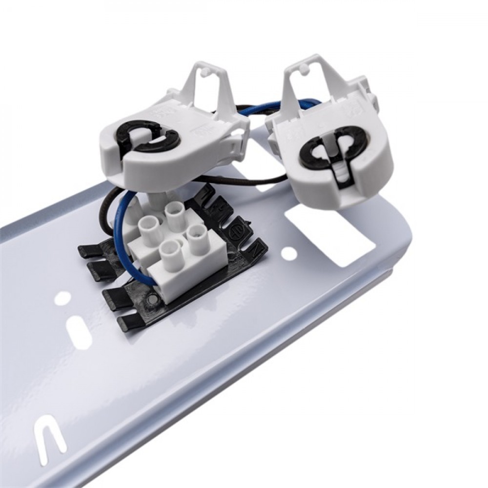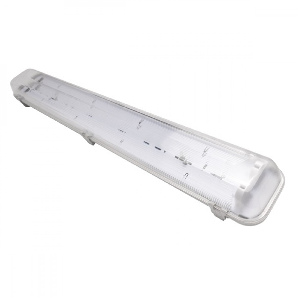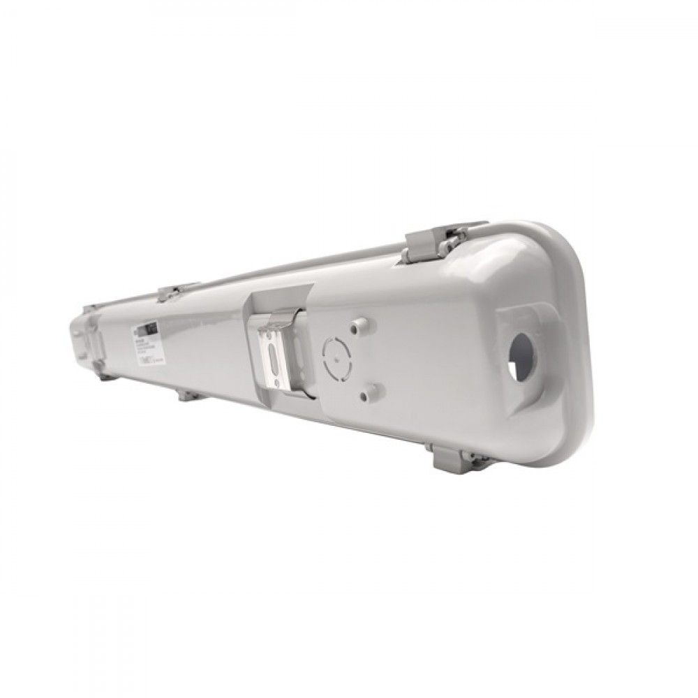 2x18 T8 ledfénycsőre előkészített por- és páramentes lámpatest, IP65 védettségű, 60cm hosszú. A ház RAL7035 világosszürke polikarbonát, a búra UV-stabilizált átlátszó polikarbonát.